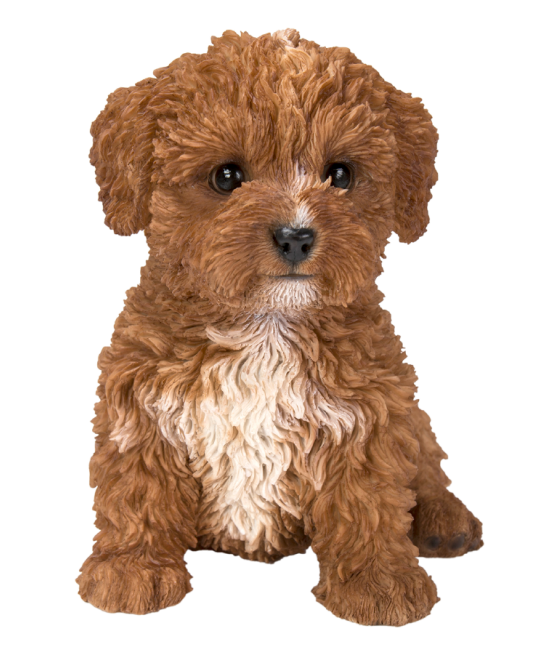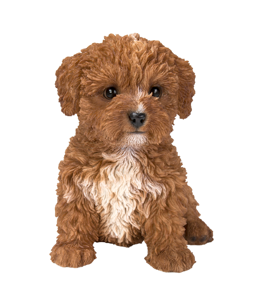 Ομοίωμα από σκυλάκι Καβαπού (Cavapoo), σε καφέ-άσπρο χρώμα, καθιστό, από ρητίνη.